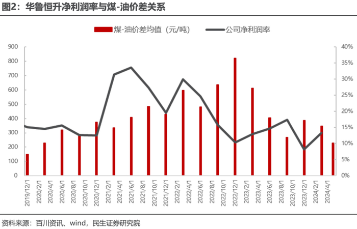 从近几年的趋势来看,2021 年煤-油价差处于相对低位,平均在约 414 元/吨,公司 2021 年净利润率约在 20%-34%的高位。2022Q4 煤-油价差达到峰值 820元/吨,成本压力较大,公司的净利润率下滑至 10%。2023 年四季度以来,由于海外油价受战争和地缘政治等因素影响,持续处于高位,煤-油价差不断缩小,公司净利润率从 2023 年 Q4 以来回升。截至 2024 年 5 月 17 日,二季度煤-油价差均值为 230 元低位,公司 2024 年盈利预期较为乐观。