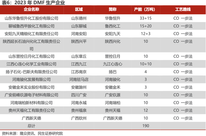 2023 年中国 DMF 行业总产能达到 190 万吨,较 2022 年新增产能 87 万吨。目前在产企业 11 家,较 2022 年的 9 家企业新增 2 家,分别是广安前峰玖源电子材料有限公司和河南瑞柏新材料有限公司。老牌 DMF 生产企业华鲁恒升、鲁西化工有增产扩建项目,行业地位持续提升。目前国内所有企业生产工艺均为 CO 一步法技术,主要催化剂为一氧化碳。