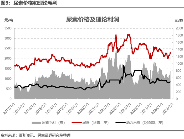 2023 年 9 月中国尿素出口量创下 118 万吨记录,此后受出口政策和国内需求旺盛影响,至 2024 年 1 月出口数量降低至 1.39 万吨。同期国内尿素价格始终维持较高水平,盈利状况较为良好。公司荆州新产能投放后,外部需求和市场环境较好,尿素业务将成为公司业绩重要的增长来源。