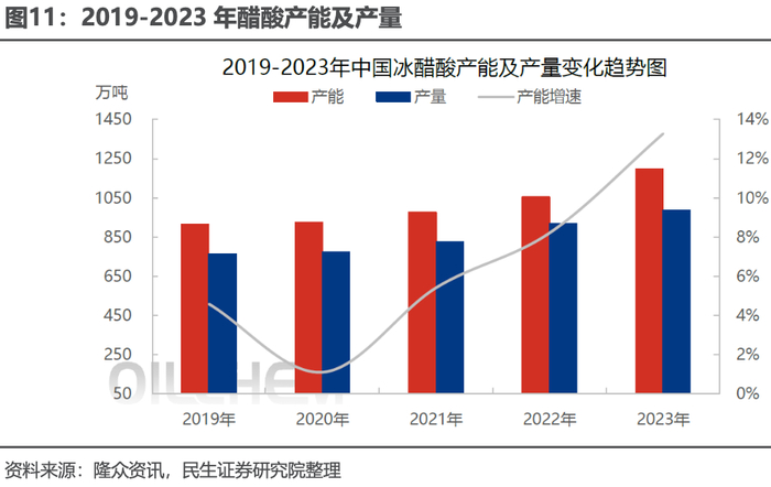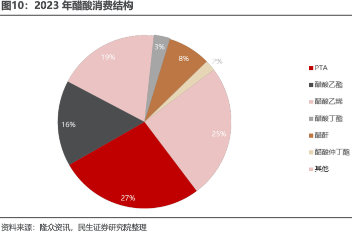 冰醋酸主要用于化工生产中各类溶剂。冰醋酸,也叫醋酸,是一种有机一元酸。冰醋酸是以甲醇和一氧化碳为主要原料,通过一系列工艺产出,纯的无水冰醋酸是无色的吸湿性液体,凝固点为 16.6°C,凝固后为无色晶体,其水溶液中呈弱酸性且蚀性强,蒸汽对眼和鼻有刺激性作用。2023 年国内冰醋酸产能达 1195 万吨,产量 989 万吨,产能利用率约 83%。冰醋酸下游行业较多,从行业下游消费结构来看,对冰醋酸消费量较大的产品有 PTA、醋酸乙烯、醋酸酯等行业,2023 年 PTA依旧是需求最大的产品,占比达到 27%。其次是醋酸乙酯、醋酸乙烯,分别占比19%、16%。冰醋酸是 PTA 生产过程中作为溶剂使用,在其成本中占比较低。由于近几年随着 PTA 行业的快速扩张且新投产能较大,对冰醋酸的使用量大幅提升。 供应逐渐宽松,公司贡献了 2023 年的主要增量产能。2019-2023 年,中国冰醋酸行业处于从供需紧平衡向供应偏宽松的方向演进,产能规模继续扩张中。得益于下游行业的快速发展,带动冰醋酸近年来产量和需求量逐年递增,后续或保持稳步提升。中小型或未配备上下游装置企业后续生产压力增大。2023 年醋酸行业新增产能 140 万吨,公司贡献了其中增量的 100 万吨。
