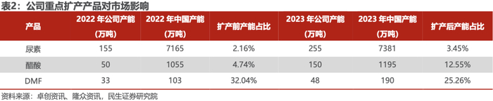 公司荆州一期项目的顺利投产,直接使得公司尿素产能从 155 万吨增长至 255万吨,增幅达 65%,醋酸产能从 50 万吨增长至 150 万吨,增幅达 200%,DMF产能从 33 万吨增长至 48 万吨,增幅达 45%。公司在这三个产品的产能增长幅度最大,新扩产产能或者公司在市场所占份额比例较低,市场可以充分消化其新增产能,或处于需求逐渐修复的通道。其中公司尿素产品的国内产能份额从 2.16%提升至 3.45%,醋酸的产能份额从 4.74%提升至 12.55%,DMF 的产能份额从 32.04%下降至 25.26%。