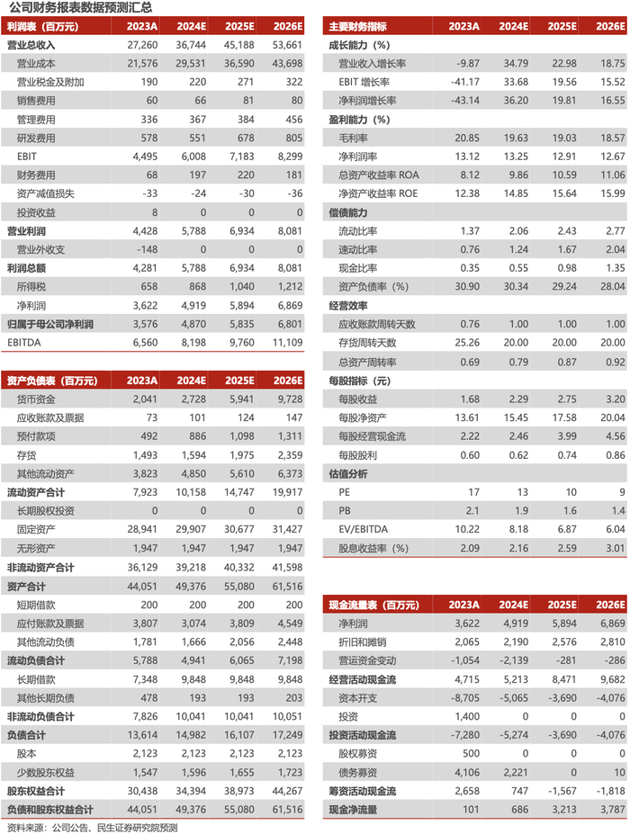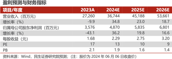 我们预计公司 2024-2026 年收入分别为 367.44 亿元、451.88 亿元、536.61亿元,归母净利润分别为 48.70 亿、58.35 亿,68.01 亿。