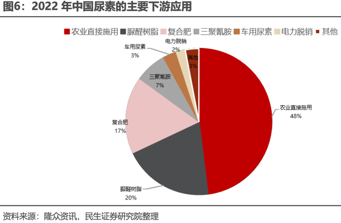 农业直接施用和复合肥间接施用为尿素主要应用下游。从市场特点角度看,尿素主要应用于农业用肥、复合肥和三聚氰胺生产、脲醛胶及板材、电厂脱硝、车用尿素等,农业直接用肥以小麦和水稻居多,用肥地区主要集中在华东、华北、西南地区,近年来随着部分地区退林还耕和国家对粮食安全的重视,农业需求占比相对稳定,2022 年直接需求占比 48%。工业用途方面,对环保问题的不断重视下,尿素因其能抑制氮氧化物的排放,近年来在柴油发动机尾期处理、电厂脱硫脱硝等环保领域消耗量呈持续增加态势,工业需求成为尿素未来发展增长点。