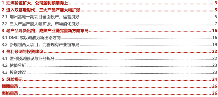 (4)醋酸及衍生品:荆州项目 2023 年底新增 100 万吨醋酸产能,产能大幅增长,下游需求稳定增长。预计 2024-2026 年收入增速分别为 150%、0%、4%,板块毛利率分别为 23%、23%、23%,相对稳定。