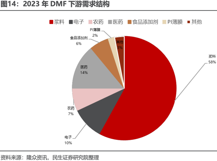 DMF,是 N,N-二甲基甲酰胺的简称,是一种用途广泛的优良化工溶剂,无色透明或淡黄色液体。主要生产原料为甲醇与合成氨,混合生成甲胺产品,其中二甲胺与一氧化碳一步生成 DMF,是目前国内所有企业最主要的生产工艺。下游主要应用于树脂浆料、电子、医药、食品、农药、聚酰胺薄膜等行业,对多种有机化合物和无机化合物均有良好的溶解能力和化学稳定性,并且我国是最大的 DMF 生产国和消费国。