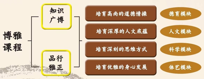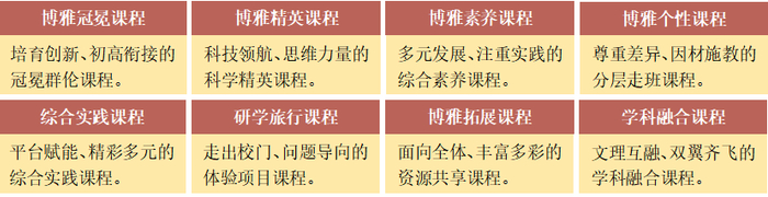博雅课程秉承“和谐”的教育理念,以强化必修课程的主导性、突出校本课程的特色性、增加选修课程的自主性、拓展活动课程的多样性为总体思路,形成了系统、丰富、创新、科学合理的课程体系。