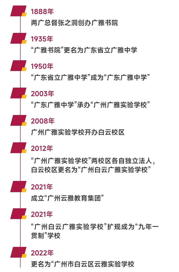 广州市白云区云雅实验学校由中国百年名校广东广雅中学于2008年创办,原名“白云广雅”,前身是广州广雅实验学校分校区,坐落于美丽的石井河畔、张九龄公园旁。