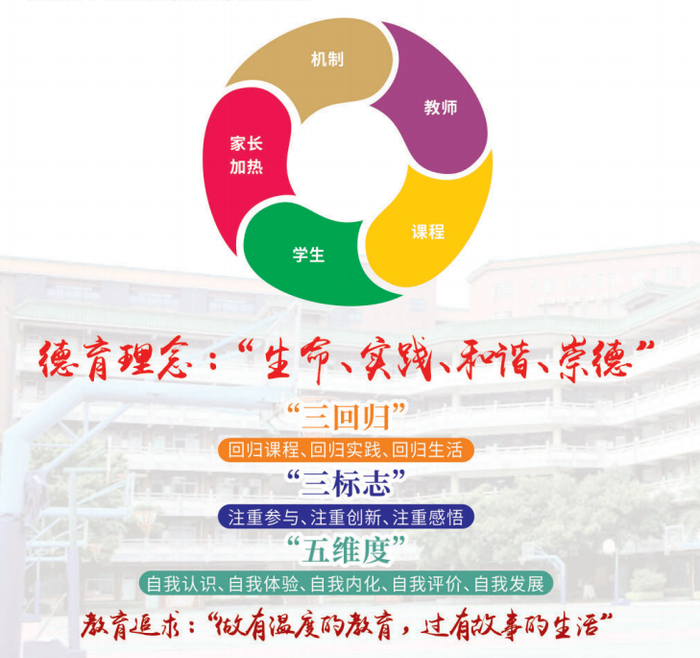 “云雅”教育品牌在全面贯彻党的教育方针基础上,坚守做“有温度的教育”,让学生丰富“有故事的生活”。经过多年的探索实践,把体现生命的活力作为出发点与落脚点,构建“三回归”(回归课程、回归实践、回归生活),“三标志”(注重参与、注重创新、注重感悟),“五维度”(自我认识、自我体验、自我内化、自我评价、自我发展)的德育模式。通过推行级部管理模式,促进“三全育人”格局。学校把“人”放在教育的正中央,大力倡行“温度教育”,教师传热、课程导热、学生受热、家长加热、机制蓄热,从而构建了“文化养人”“课程育人”“活动育人”“协同育人”“心育助人”“实践育人”等多维度德育工作特色项目。