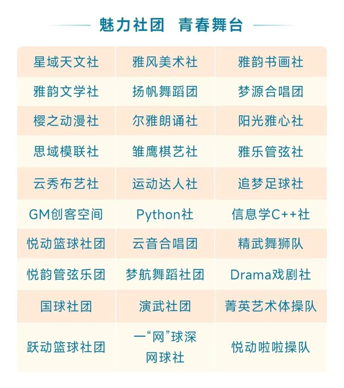 在云雅,孩子们可以在“YaCafe”咖啡馆品一杯咖啡,在唇齿间的芳香中,品味有故事的生活;也可以在缤纷多彩的社团里,结识志同道合的伙伴,一同分享快乐,一起迎接挑战和成长。
