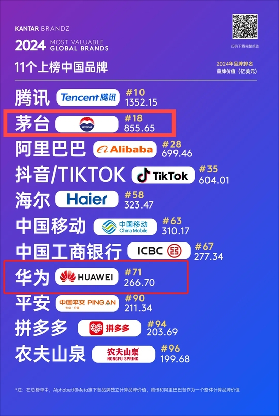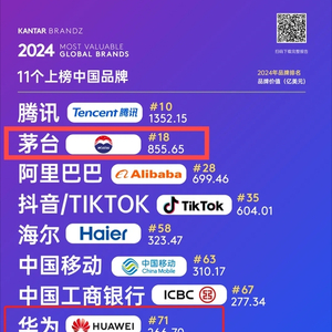 在100强上榜的11家中国品牌中,茅台位列第2,排名腾讯之后,后8位分别是阿里巴巴、抖音/TIKTOK、海尔、中国移动、中国工商银行、华为、平安、拼多多、农夫山泉。与2023年的14家上榜企业相比,2024年中国上榜企业减少了3个。