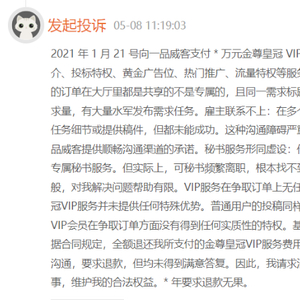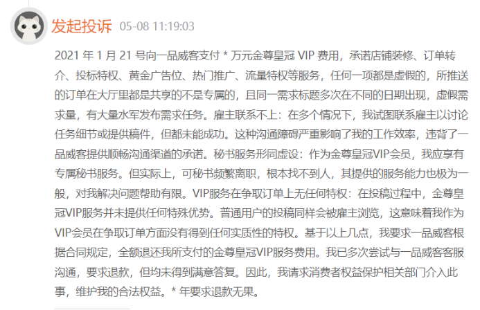 黑猫投诉显示,截至6月12日,关于一品威客的投诉累计为149条,已完成86条。其中有部分是一品威客的VIP用户投诉称VIP权益未能享受,涉嫌虚假宣传。还有部分普通用户投诉称,“未提供实质性服务,申请退款难”、“订单虚假,投诉无门”、“未满足用户需求却不退款”等情况。