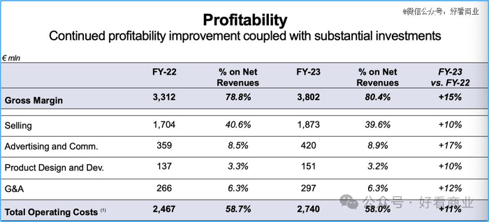 以2023年为例,Prada集团的销售费用率高达40.6%,产品研发费用率仅为3.2%,在各项费用中占比*。