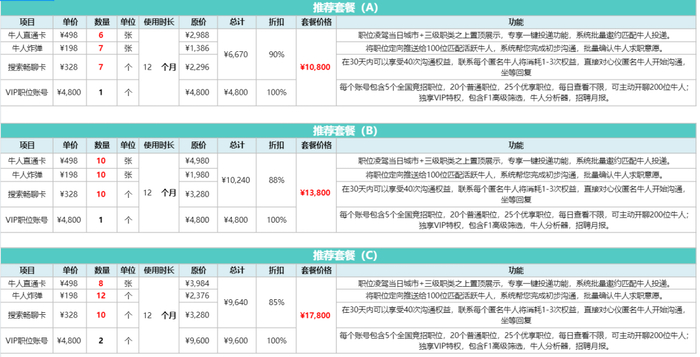 此外,BOSS直聘还有多项套餐,最贵的达到30000多元。