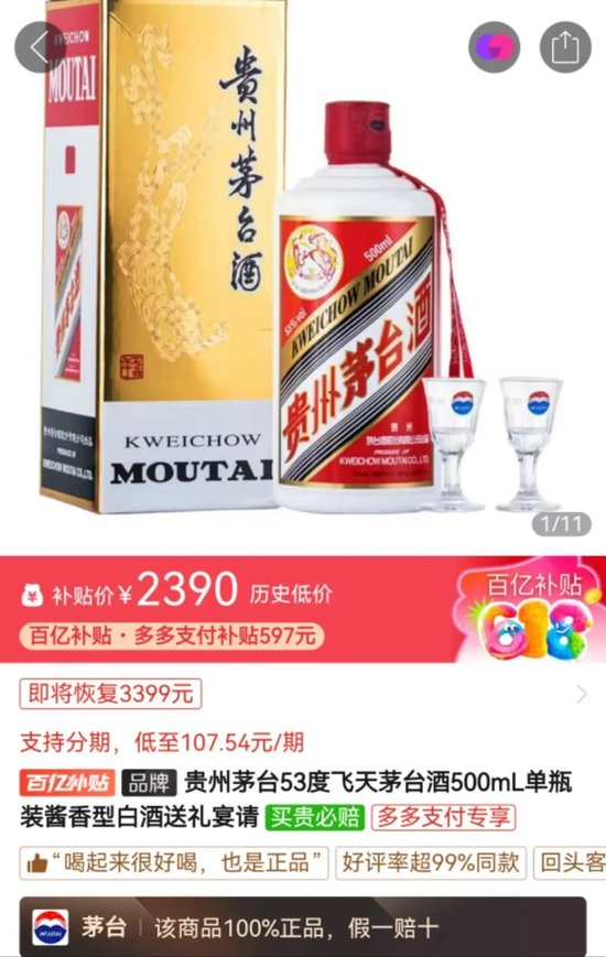 而拼多多的商品搜索下,部分商家将飞天茅台定价为2309元/瓶。