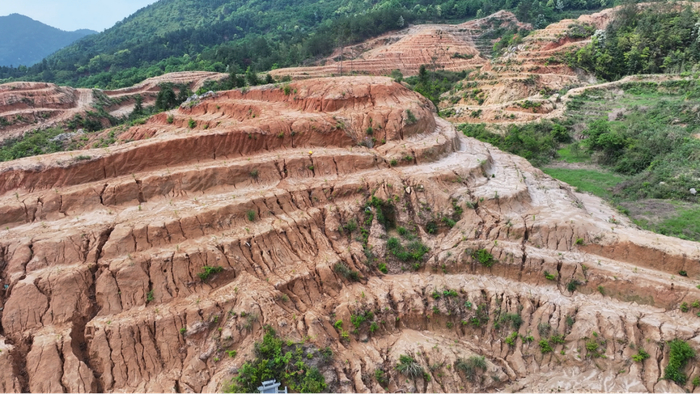 走进修水县漫江乡,眼前的画面令人瞠目结舌。与周围的苍翠不同,面前这座山的“绿衣”已消失不见,光秃秃的山体失去了原本的生气。山顶被削为圆盘状,山体被整修为层层阶梯状。走上前近看,一道道细细的纵深沟壑从山顶蔓延至山脚,密密麻麻长满了整座山,像皱纹、像伤疤,亦像眼泪。
