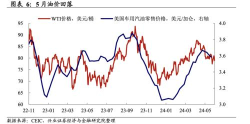 油价平稳,能源环比回落,但仍需关注地缘以及供给端压力。今年5 月美国汽油零售价格回落,CPI 燃油分项环比增速回落超 6pct 至-3.5%,但同比增速因去年的低基数而上浮 1.1pct 至 1.9%。能源环比增速回落 3.2pct至-2%,同比增速上浮 1.1pct 至 3.7%。5 月地缘风险频发但原油价格反应有限,WTI 价格略低于 80 美元/桶,但后续仍需关注地缘风险升级可能及潜在影响。6 月2 日OPEC+会议确认延长减产至 2025 年,关注供给端压力。