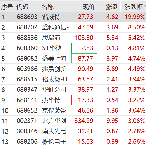 半导体指数盘中走高,锴威特20CM涨停,盛科通信、思瑞浦、盛美上海等跟涨。