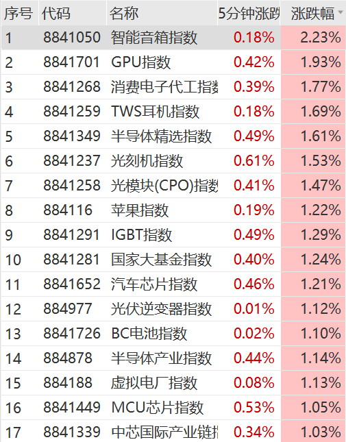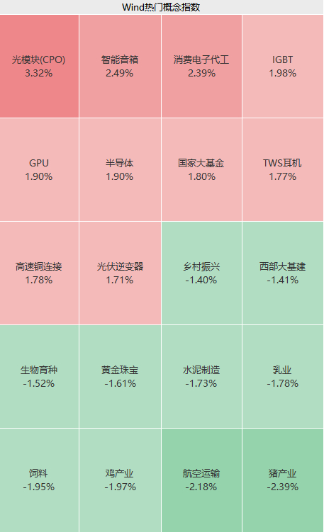 盘面上,上午消费电子、汽车、半导体、通信设备等板块走高,光模块、智能音箱、国家大基金等概念涨幅居前;农业股不振,航空、贵金属、教育等板块下行。