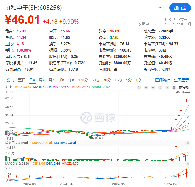 6月13日上午,PCB(印制电路板)概念继续火热,迅捷兴盘中触及20CM涨停,协和电子走出8连板。