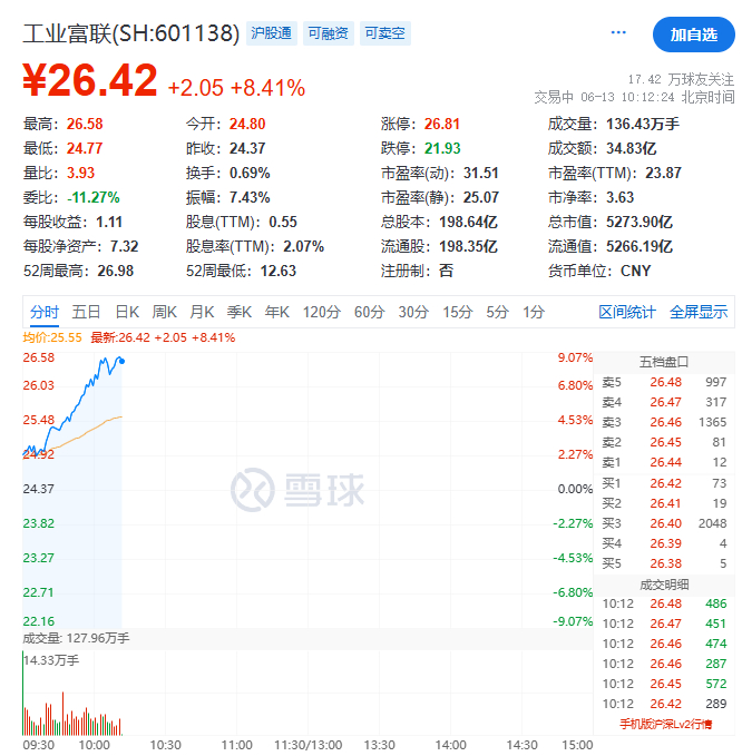 工业富联直线冲高,盘中涨超9%。