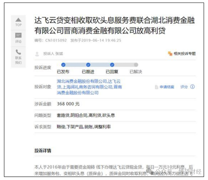 而回溯公开报道可知,湖北消金联合小贷公司或助贷平台,作为资方而被投诉涉嫌“变相收取砍头息”“放高利贷”的“历史”,早在2019年就曾见诸网络投诉平台。