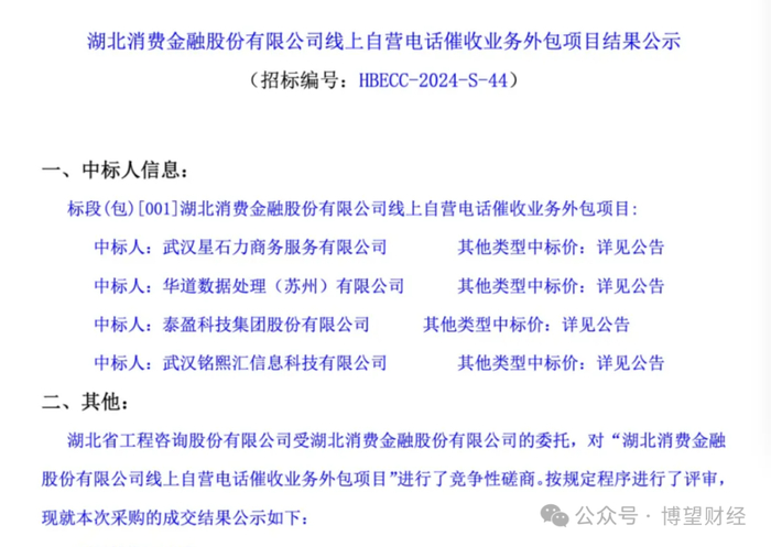 日前,一则《湖北消费金融股份有限公司线上自营电话催收业务外包项目结果公示(招标编号:HBECC-2024-S-44)》引发业界高度关注。