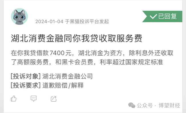 此外,梳理黑猫投诉平台关于湖北消金的投诉事件还发现,其作为资方,还涉及与“你我贷”等平台向借款人收取高额服务费和所谓“黑卡会员费”的情形。