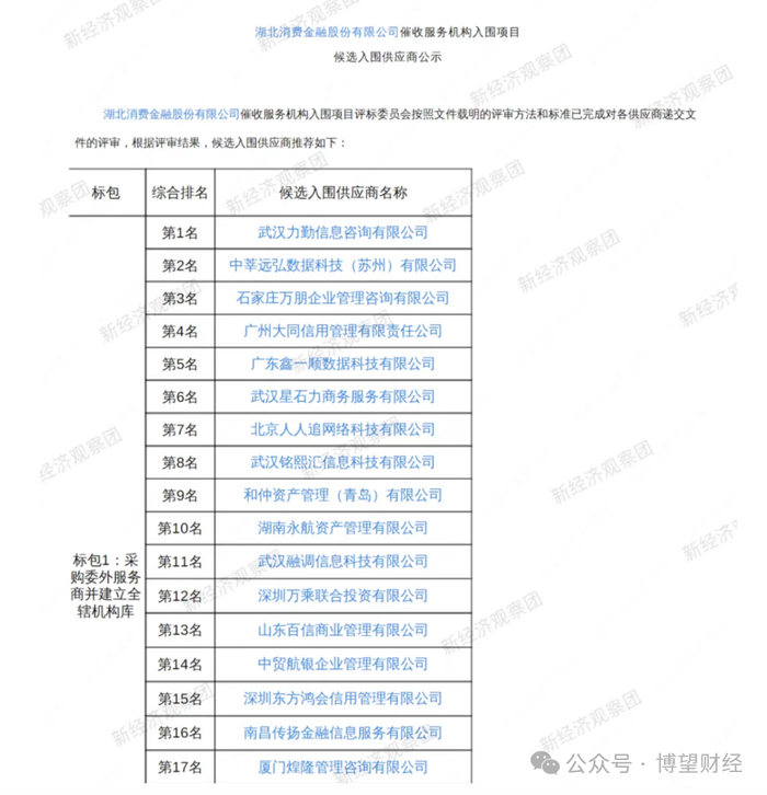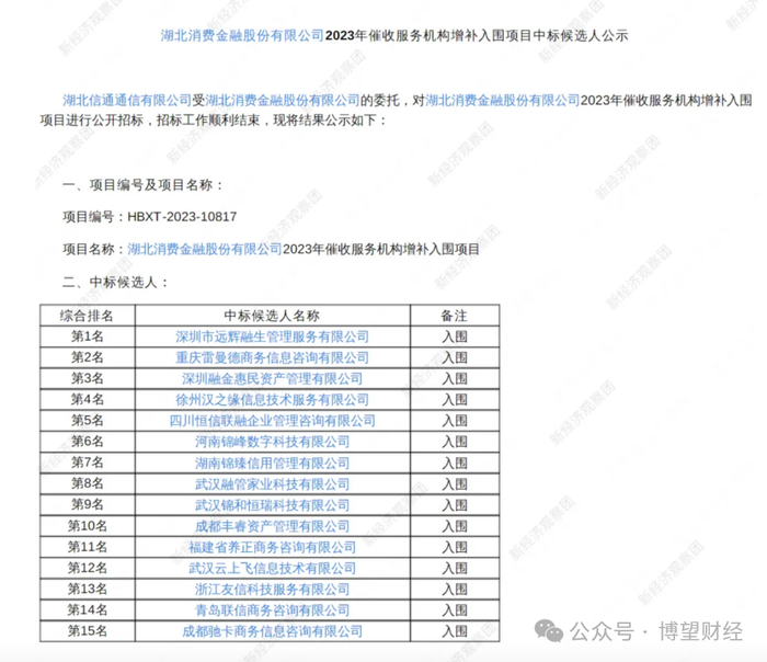 为尽可能多、尽可能快地收回“欠款”,湖北消金这两年足够“卖力”。早在去年5月,湖北消金就披露了一份《湖北消费金融股份有限公司2023年催收服务机构增补入围项目招标中标候选人公示》的官方文件。公示指出,当时湖北消金增补入围15家催收机构。