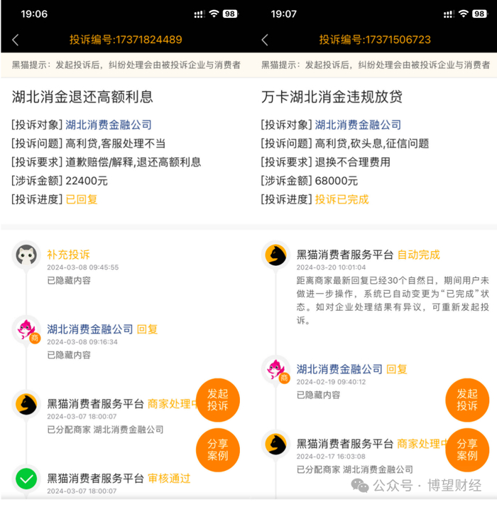 这一点,在黑猫投诉平台上,仅今年3月,即有两起关于湖北消金涉嫌“违规放贷”“高利贷”“砍头息”的相关投诉事例。
