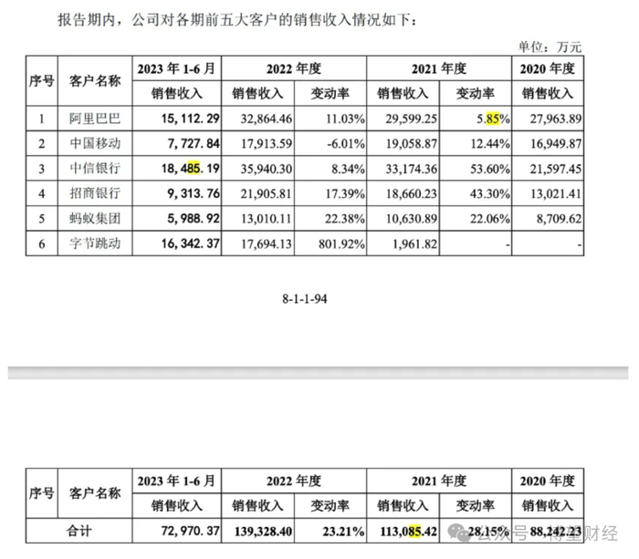 另有公开数据显示,仅阿里巴巴就在报告期内分别贡献了27964万元、29599万元、32864万元及15112万元的收入。此外,对中信银行的收入则分别为21597万元、33174万元、35940万元及 18485万元。
