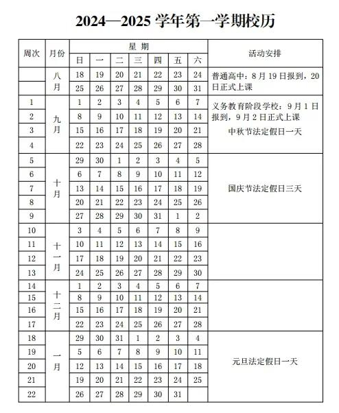 全市义务教育学校放假时间定于2024年7月5日至2024年8月31日,2024年9月1日正式上课;普通高中学校放假时间定于2024年7月14日至2024年8月25日,2024年8月26日正式上课。