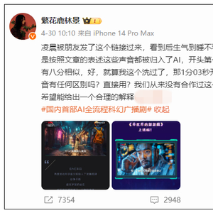 4月24日,配音演员赵乾景将声音授权给AI有声剧《凡人修仙传》,用于训练多音色AI人声,引起轩然大波。有人认为AI的介入是大势所趋,也有人觉得这是对配音艺术的践踏,挤压新人配音员的生存空间。