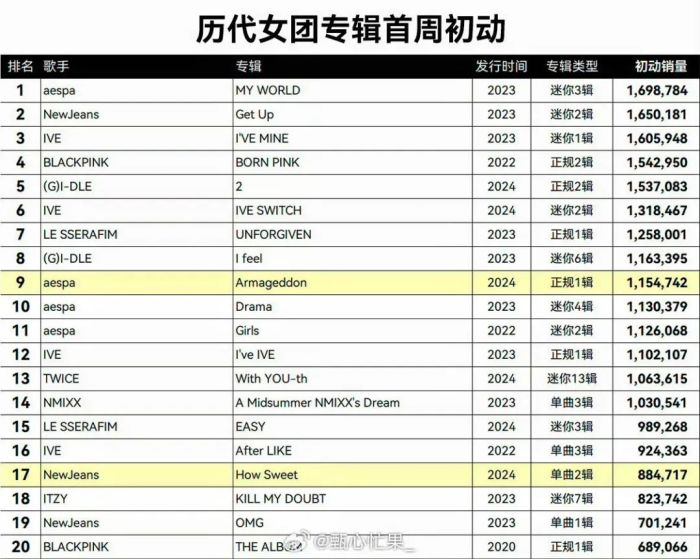 如上文所述,New Jeans与aespa所争夺的专辑销量初动纪录便是如此,这决定着新一代女团纪录,以及率先出线拿下女团登顶交接棒候补名额的归属。