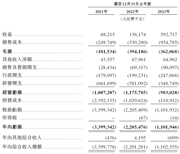 招股书显示,在过去的2021年、2022年和2023年,英诺赛科的营业收入分别为人民币0.68亿、1.36亿和5.93亿元,相应的净亏损分别为人民币33.998亿、22.01亿和11.03亿元,相应的经调整净亏损分别为人民币10.81亿、12.77亿和10.16亿元。
