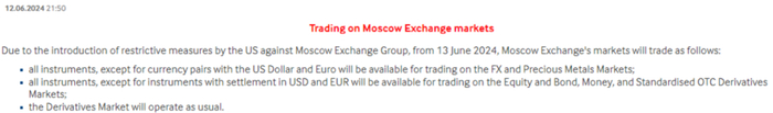 当地时间6月12日,俄罗斯最大的交易所—莫斯科交易所(MOEX)宣布,当地时间13日起,将暂停美元和欧元交易。