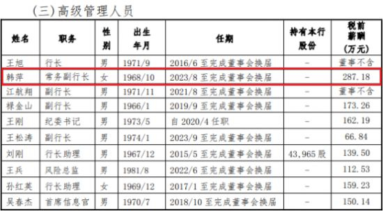 值得一提的是,在大连银行2023年度报告中显示,韩萍的薪酬为287.18万,远超其他高管薪酬,是该行披露出的所有高管中薪酬最高的,不知这一数目是否叠加了她作为成都分行行长时的薪酬,但不管是否叠加,都能看出韩萍十分受重视。副行长穆金山去年薪酬173.26万元,其实也挺高,但还是不如韩萍。该行其他高管的薪酬就更不如韩萍了。