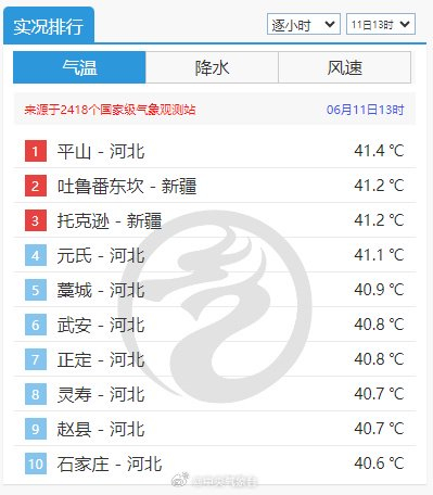 6月11日13时,河北平山实时气温达41.4℃,超过新疆吐鲁番。河北全省多地气温突破40℃。