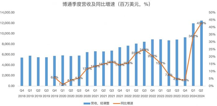 从财报上看,博通24财年二季度营收124.87亿美元,超过分析师预期的120.57亿,同比暴增43%,主要是去年末巨资收购的Vmware并表,扣除此影响,博通营收增速为12%: