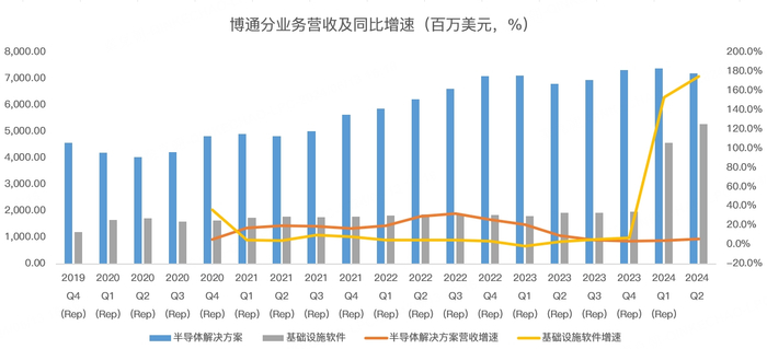 从24财年二季报来看,博通的半导体解决方案营收72亿,同比增长5.8%,基础设施软件营收52.85亿,同比增长174.5%: