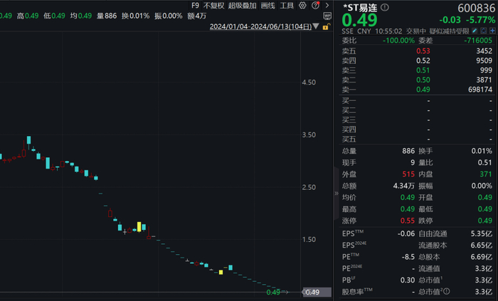 6月13日,*ST易连继续跌停,这是该股近期第13个跌停板。