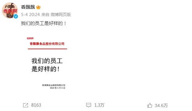 5月4日 20:24,香飘飘官方微博发布了“我们的员工是好样的!”博文内容。后续香飘飘董事长蒋建琪拉着“欢迎香飘飘勇士归来!”的横幅接机赴日回国员工的照片也很快流出,引起社会热议并快速冲上热搜。消费者也涌入香飘飘直播间踊跃购买同款产品,直播间销售额暴增400倍。香飘飘总裁杨冬云在直播间还表示对好样员工奖励10万元,并捐出直播当晚8点至24点的所有直播收入给环保基金会。