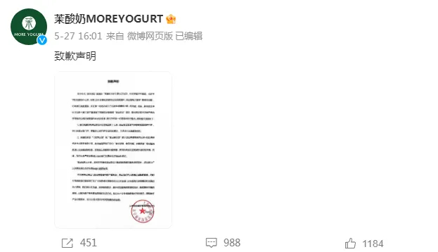 当天,茉酸奶官博发布致歉声明。声明称,所涉及的4家门店严重违背了茉酸奶所提倡的“食品安全”理念,在日常运营中均未严格执行茉酸奶总部的运营操作和培训标准。针对涉事加盟门店已经安排即刻闭店,并将永久解除合约。此外,将对全国所有门店的“食材存储、食品效期、水果保存”等问题再度进行全面细致检查,并对所有员工定期进行培训和考核等。