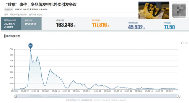4月11日,ID为“胖猫”的游戏代练因与女友情感纠纷,在重庆长江大桥跳江轻生。后续该事件引发公众广泛关注。据了解,“胖猫”日常仅下单十元左右的外卖,其微信签名为“我不要吃菜,我要吃麦当劳”。因此,5月2日,各地网友纷纷通过寄送汉堡、饮料等外卖的形式对“胖猫”进行祭奠。5月3日凌晨,网友发现部分外卖有空包、用纯净水代替奶茶等情况,涉及蜜雪冰城、华莱士、朱小小螺蛳粉等多家知名连锁品牌,由此引发公众愤怒与舆论谴责。5月3日,涉事品牌紧急发布致歉声明,表示严惩涉事人员及门店,进行退款补偿,部分品牌还以“胖猫”名义进行捐赠。后续,“12315回应外卖空包事件”“官方介入调查空包外卖”等话题集中登上热搜榜单。