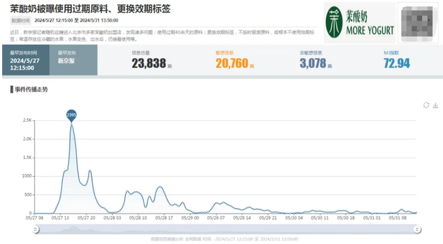 ③舆情继续发酵的可能性:目前监测数据来看,茉酸奶早期的多个敏感舆情事件被重新提及,舆论在持续发酵中,预估媒体和消费者的关注度可能不会迅速降低,负面影响可能会持续一段时间。