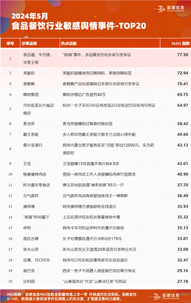 近日,苗建信息食品安全舆情监测中心发布《2024年5月份中国食品餐饮行业主要舆情事件监测报告》显示,“胖猫”事件,多品牌发空包外卖引发争议”“茉酸奶被曝使用过期原料、更换效期标签”“香飘飘产品包装嘲讽日本核污水排海引发争议”是5月舆情热度最高的三大事件。