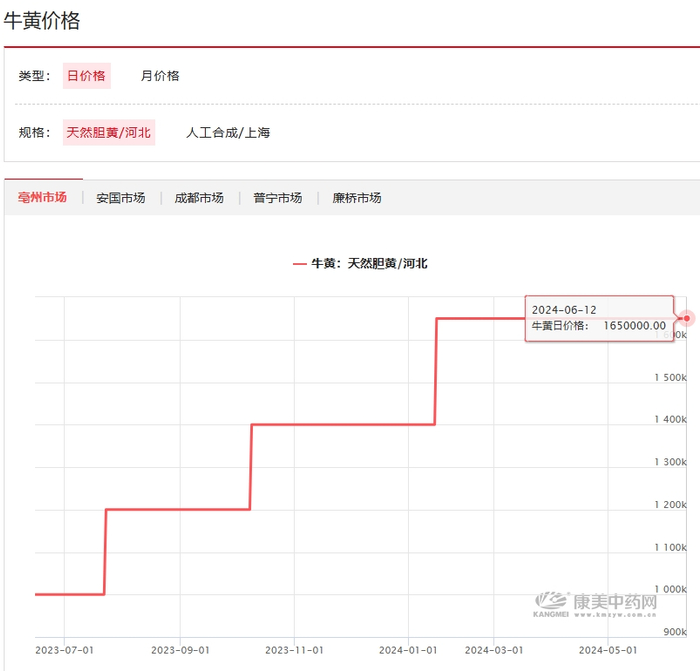 康美中药网数据显示,天然牛黄价格从2023年3月开始持续飙升,截至2024年6月12日,已攀升至每公斤165万元,而目前每公斤黄金的价格约为54.54万元。