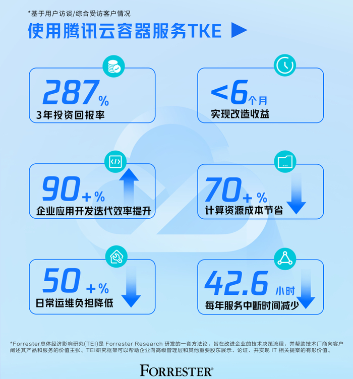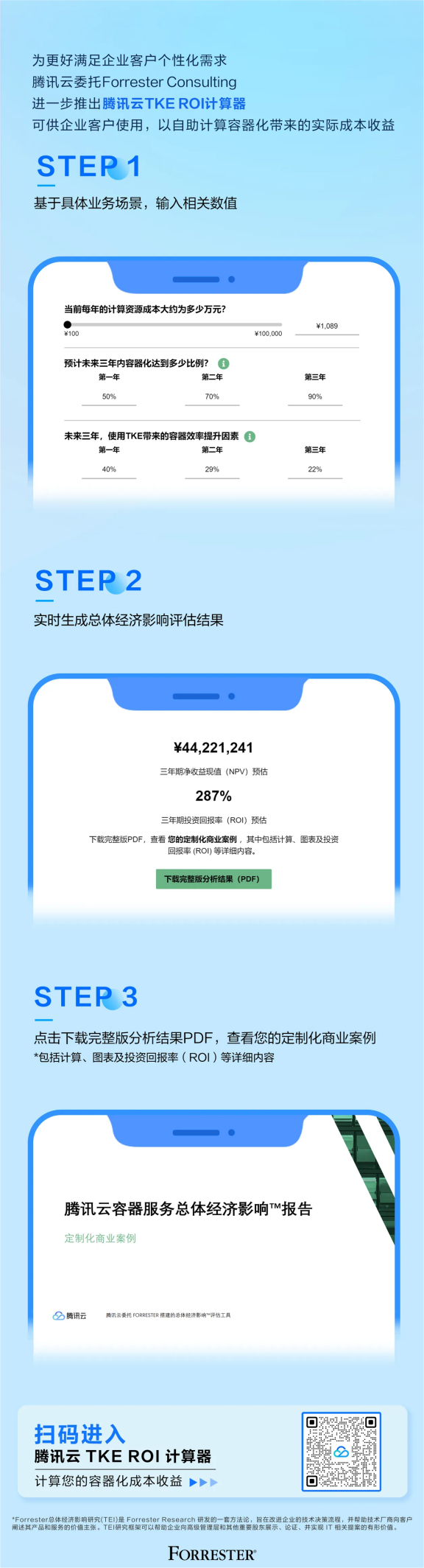 此外,因企业 IT 投资回报分析渐趋复杂,腾讯云委托 Forrester Consulting 推出腾讯云 TKE ROI 计算器,企业可利用其分析框架,依自身情况开展 TKE 投资决策评估。