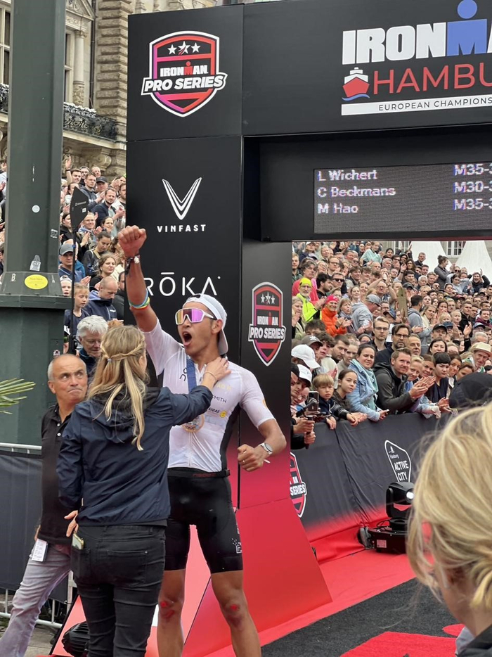苗浩出现在大众视野,是在6月2日的IRONMAN德国汉堡铁人三项欧锦赛上。冲线的最后瞬间,体力不支的苗浩摔倒在地,随后爬着到达终点。