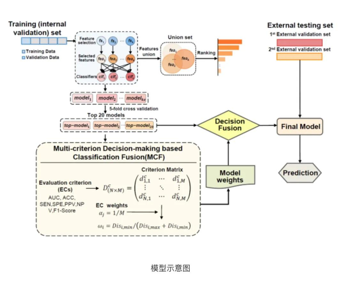 使用基于多标准决策的分类融合(MCF)风险预测框架建立了一个模型,该模型结合了20个AI分类模型的估计值,以形成为卵巢癌诊断开发的综合预测工具。该工具在内部验证集(3,007人)和两个外部验证集(5,641人和2,344人)上进行了评估。主要结果是该模型在识别卵巢癌方面的预测准确性。
