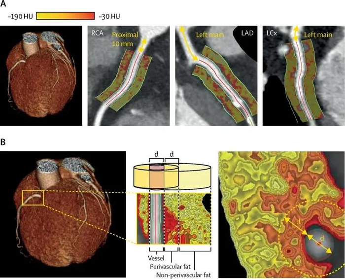 由于动脉中分泌的炎症信号可以驱动血管周围脂肪组织的变化,因此可以反过来,用标准化的脂肪衰减指数(FAI)量化估计冠状动脉炎症的情况。